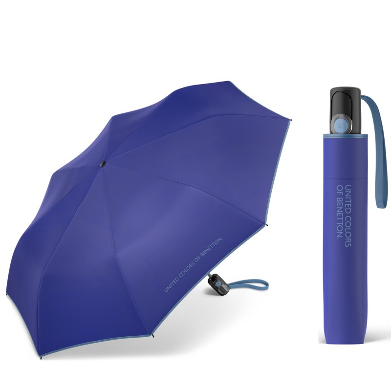 Automatyczna, lekka, parasolka BENETTON United Colors jednokolorowa z kontrastowym obszyciem. Otwierana za pomocą przycisku, a składana manualnie.